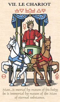 • 8. VII Колесница — Колесница часто обозначает человека активного, постоянно движущегося к достижению цели. Такой человек никогда не доволен достигнутым: вместо этого он всегда стремится к новым приключениям и идет новыми путями. Такой человек хочет мгновенно получить результат и становится нетерпеливым по отношению к тем, кто не поспевает за ним. Негатив: этот человек, будучи слишком амбициозным, не останавливается ни перед чем для достижения своей цели.